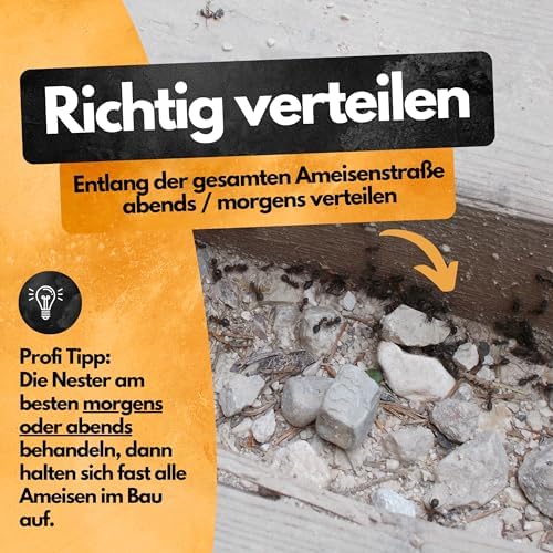 Für die beste Wirkung empfehlen wir, die Ameisennester am Morgen oder Abend zu behandeln, wenn sich die meisten Ameisen im Bau aufhalten. Dies ist die beste Zeit, um das Ameisenstreu oder die Gießlösung aufzutragen. Achten Sie darauf, alle betroffenen Bereiche gründlich zu behandeln, um die gesamte Ameisenpopulation effektiv zu reduzieren.