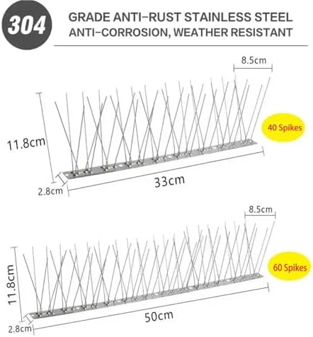 Mit den Abmessungen von 50 x 2,8 x 11 cm und 33 x 2,8 x 11 cm bieten die Vogelstacheln die ideale Größe für verschiedene Flächen und Installationsbedürfnisse. Diese kompakten Maße ermöglichen es, die Stacheln unauffällig zu platzieren, ohne das ästhetische Gesamtbild zu stören.