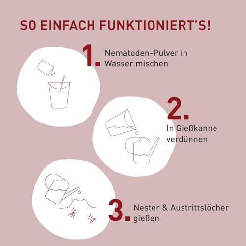Die Anwendung unserer Nematoden ist denkbar einfach: Lösen Sie das Pulver in Wasser auf und gießen Sie es direkt auf die Ameisen-Nester und Austrittslöcher. Eine detaillierte Anleitung ist natürlich inklusive. Zudem können Sie die Mischung bis zu 6 Wochen im Kühlschrank lagern, sodass Sie immer bereit sind, aktiv gegen die Ameisen vorzugehen.