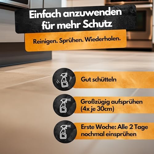 Die Anwendung unseres Sprays ist denkbar einfach: Sprühen Sie großzügig in Ecken, Ritzen, hinter Küchengeräten oder entlang von Fußleisten und Böden. Für den höchsten Schutz wiederholen Sie die Anwendung in der ersten Woche alle zwei Tage. So gewährleisten Sie, dass Ihr Zuhause optimal geschützt ist. Qualität und Wirksamkeit – Made in Germany!