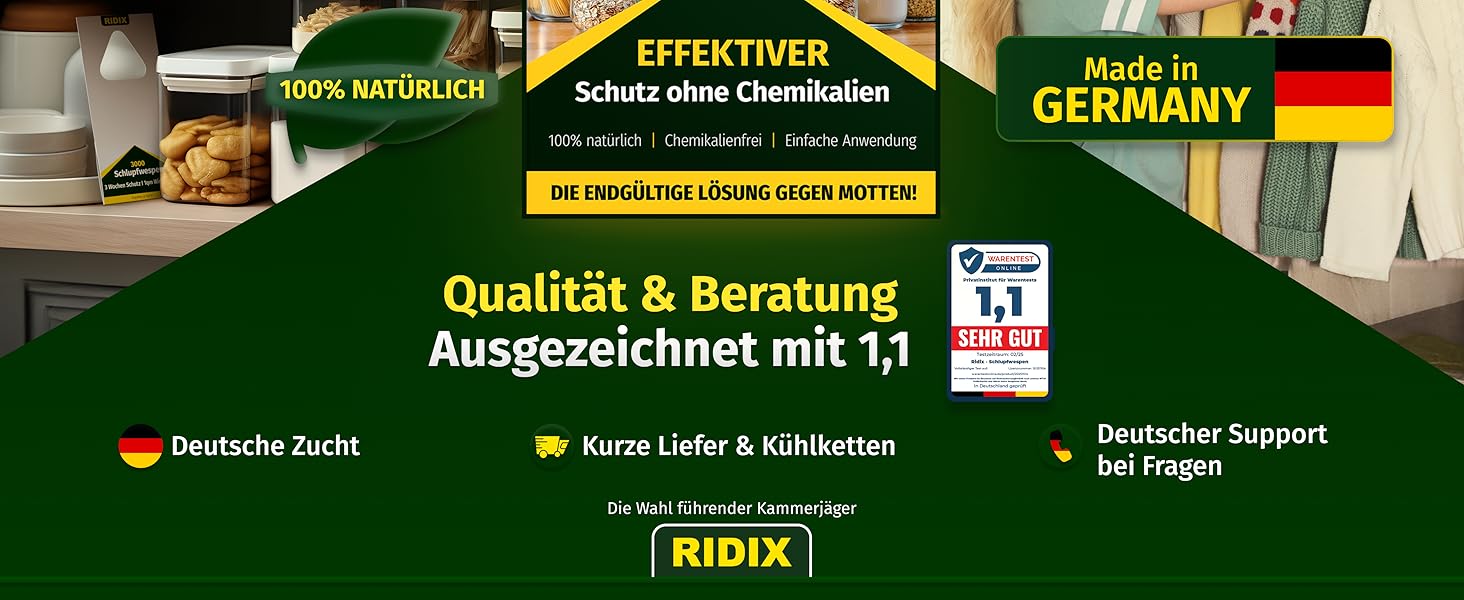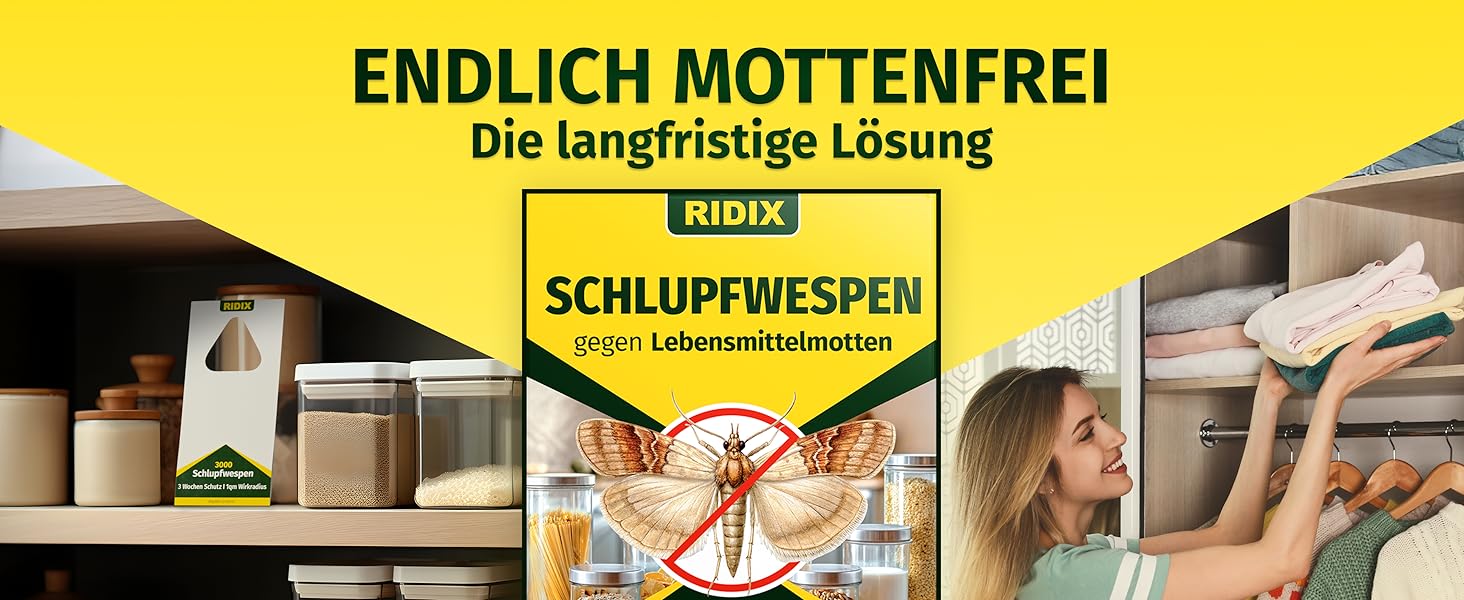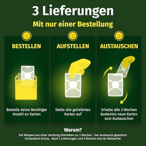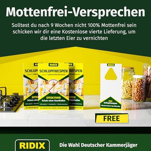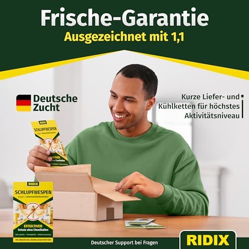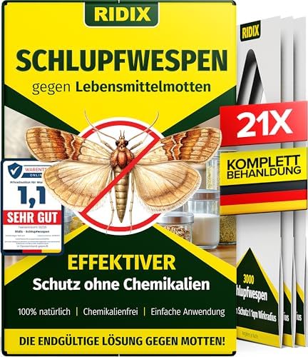 Wir setzen auf hochaktive Ikneumonwaspen aus deutscher Zucht, die jedes Zuhause von Motten befreien. Sollte es dennoch nicht gelingen, erhalten Sie die 4. Lieferung gratis! Bereiten Sie sich auf ein mottenfreies Zuhause vor und investieren Sie in Ihre Sicherheit. Jetzt Ikneumonwaspen kaufen und genießen Sie ein mottenfreies Leben!