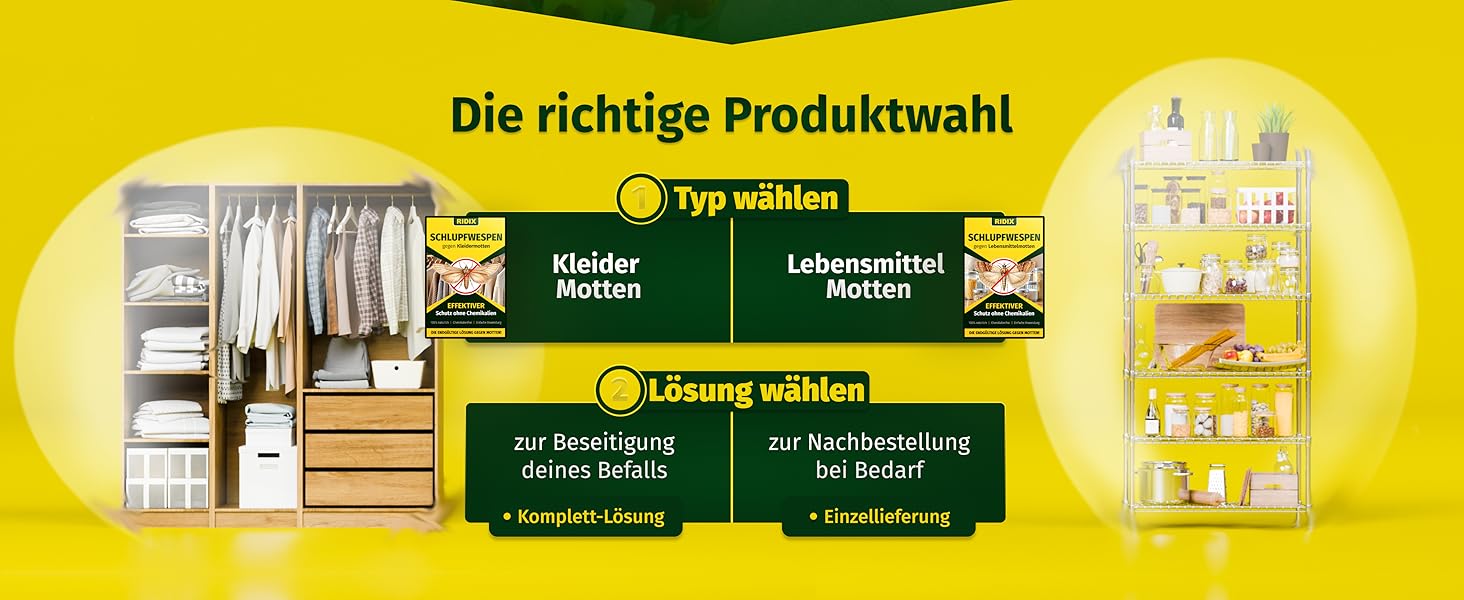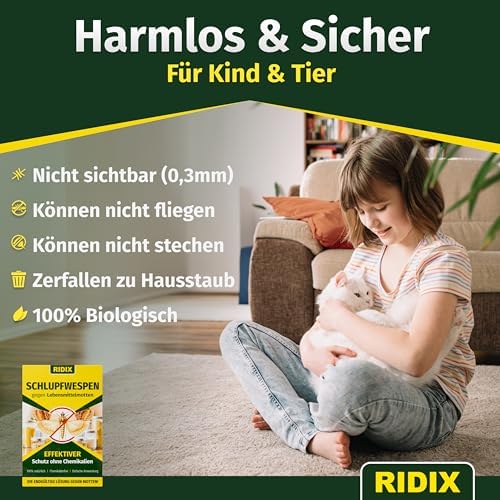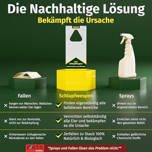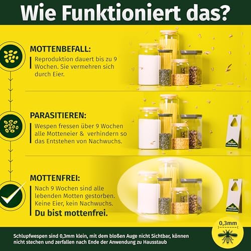 Unsere Ichneumonwaspen stellen eine besonders angenehme und harmlose Lösung dar. In nur 9 Wochen kümmern sich diese kleinen Helfer ohne jegliches menschliches Eingreifen um das Mottproblem, ganz ohne die Verwendung schädlicher Chemikalien. Der Einsatz dieser lebendigen Bekämpfer ist nicht nur sicher, sondern auch effektiv, was Ihnen die Sorge um nutzlose Chemikalien in Ihrem Zuhause erspart.