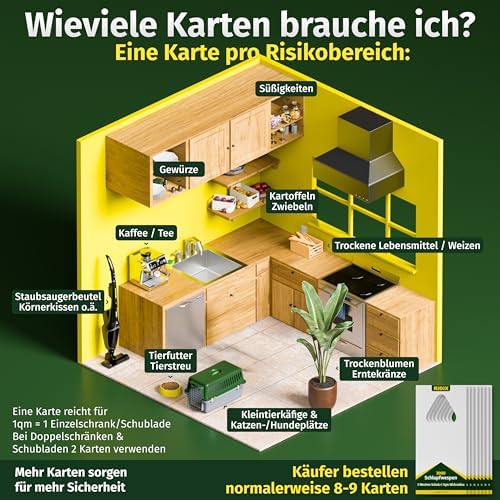 Eine einzelne Karte reicht aus, um bis zu 1 m² Fläche effektiv gegen Motten zu schützen. Ideal für risikobehaftete Bereiche wie Vorratskammern und Küchenschränke. Die einfache Anwendung ermöglicht es Ihnen, alle kritischen Zonen mühelos abzudecken, sodass Sie auch in schwer zugänglichen Bereichen sorglos sein können.