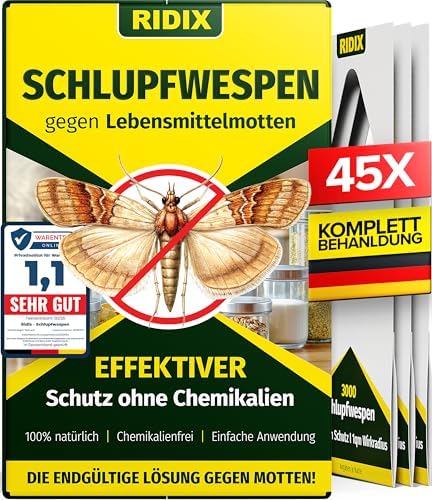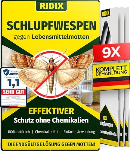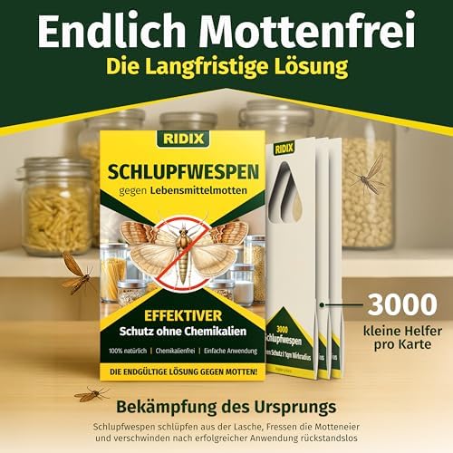 Mit 3000 schlüpfenden Lebewesen pro Karte bieten wir eine effektive, biologische Methode zur Bekämpfung von Lebensmittelmotten. Die als natürliche Räuber agierenden Ikneumonfliegen eliminieren zuverlässig die Motteneier, sodass Sie ohne Sorge Ihre Vorräte aufbewahren können. Diese nachhaltige Alternative zum chemischen Einsatz schützt nicht nur Ihre Nahrungsmittel, sondern auch die Umwelt.