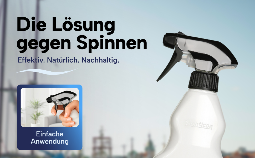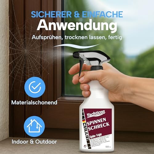 Der Yachticon Spinnenabweis funktioniert durch die Kraft der Natur – er weist Spinnen und andere Insekten effektiv ab, ohne sie zu töten. Die enthaltenen Inhaltsstoffe sind biologisch abbaubar und schützen sowohl Oberflächen als auch die Umwelt. Das Produkt hinterlässt keine permanenter Rückstände und ist für viele Materialien geeignet.