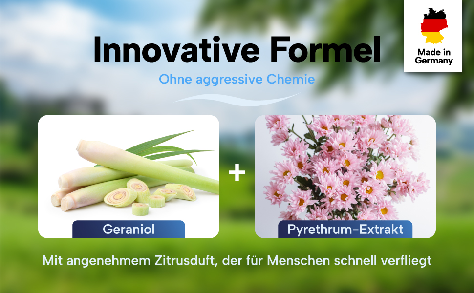 Die hochwirksame Formel basiert auf Geraniol, einem natürlichen Bestandteil ätherischer Öle, und Pyrethrum-Extrakt aus Chrysanthemenblüten. Geraniol ist auch in der Parfüm- und Kosmetikindustrie weit verbreitet und bekannt für seine biostatischen Eigenschaften, die Spinnen, Mücken, Ameisen, Zecken und andere Insekten abwehren.